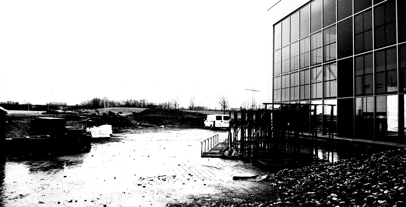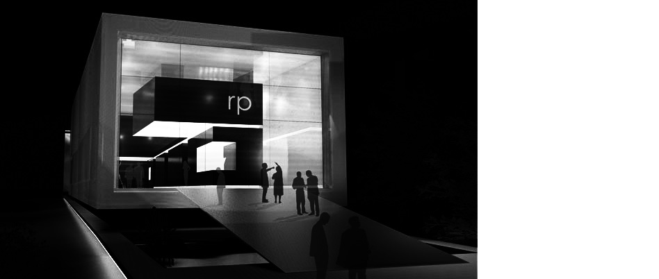 Für die Firma rp- Technik sollte ein Showroom mit Schulungsräumen geplant werden. Besonderes Augenmerk wurde auf die corporate identity des Unternehmens und auf die Lichtplanung gelegt. Um die Fernwirkung zur nahe gelegenen A2 und die Hinführung zum Gebäude über das Grundstück zu realisieren, dient eine langgezogene Ebene als Grundlage. Auf diese wurden das Gebäude, eine Werbefläche als Startpunkt und eine Leinwand als Endpunkt aufgesetzt. Integrierte Wasserbecken und die konsequente Beleuchtung vervollständigen das Gesamtensemble. Das Gebäude ist als „Röhre“ konzipiert, in welche die Funktionen als Boxen hineingestellt werden. Im unteren Teil befindet sich ein offener Raum für Präsentationsaufgaben und sowie Aufenthaltsflächen. Die Schulungsräume werden von der Decke abgehängt. Dadurch ist von jeder Position auf der Ebene einen Blick zum anderen Ende möglich. Das Material Stahl in Form eines Fassadennetzes, die großen Glasfassaden im RP-eigenen Bausystem, sowie die nächtliche Beleuchtung in den ci-Farben, erzeugen eine gute Fernwirkung, die die corporate identity darlegt.
